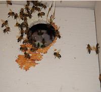 African honeybee colonies are always dangerous to handle, sometimes lethal, and can cause tremendous damage to homes and commercial building structures if not treated properly. Improper methods worsen the damage and lead to future bee problems. Bee pheromone, a marker scent the bee colony deposits at the site, does not go away on its own and cannot simply be scrubbed away with soap and water. A passing swarm can pick up the marker from a considerable distance away and will try to re-occupy a former bee site before it will go anywhere else. Honeycomb, if not removed properly, will immediately start attracting robbing bees from other local colonies and begin liquefying and melting down. Honeycomb meltdown can saturate building materials like drywall and insulation, cause wet rot to framing structures, attract other unwanted pests and spread pheromone scent throughout your walls making the problem much larger.